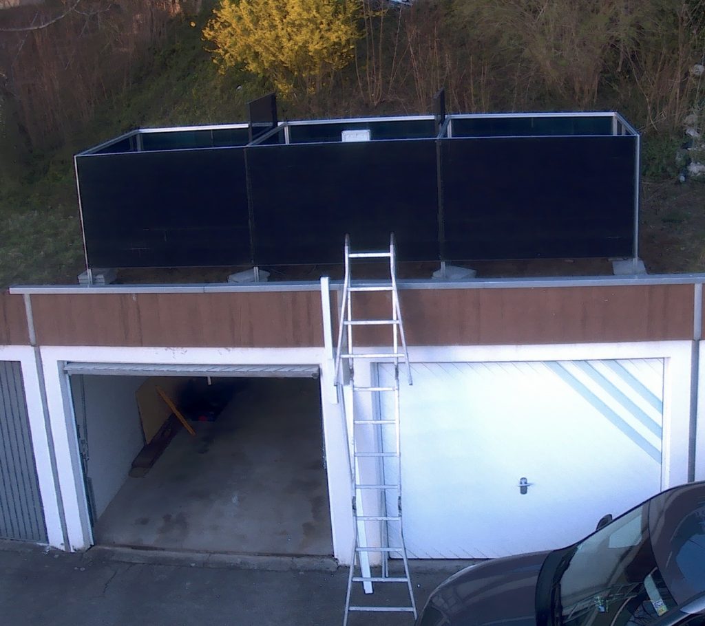 Bild links: Gemeinsam mit einem Zimmermann aus Singen haben wir diese elegante Terrassenüberdachung errichtet. Für die Kunden war es besonders wichtig, dass alle Kabel unsichtbar verlegt werden. Aus diesem Grund haben wir die Wechselrichter geschickt in die Fassade integriert. So entsteht nicht nur eine ansprechende Optik, sondern auch eine funktionale und elegante Lösung für die Photovoltaikanlage.